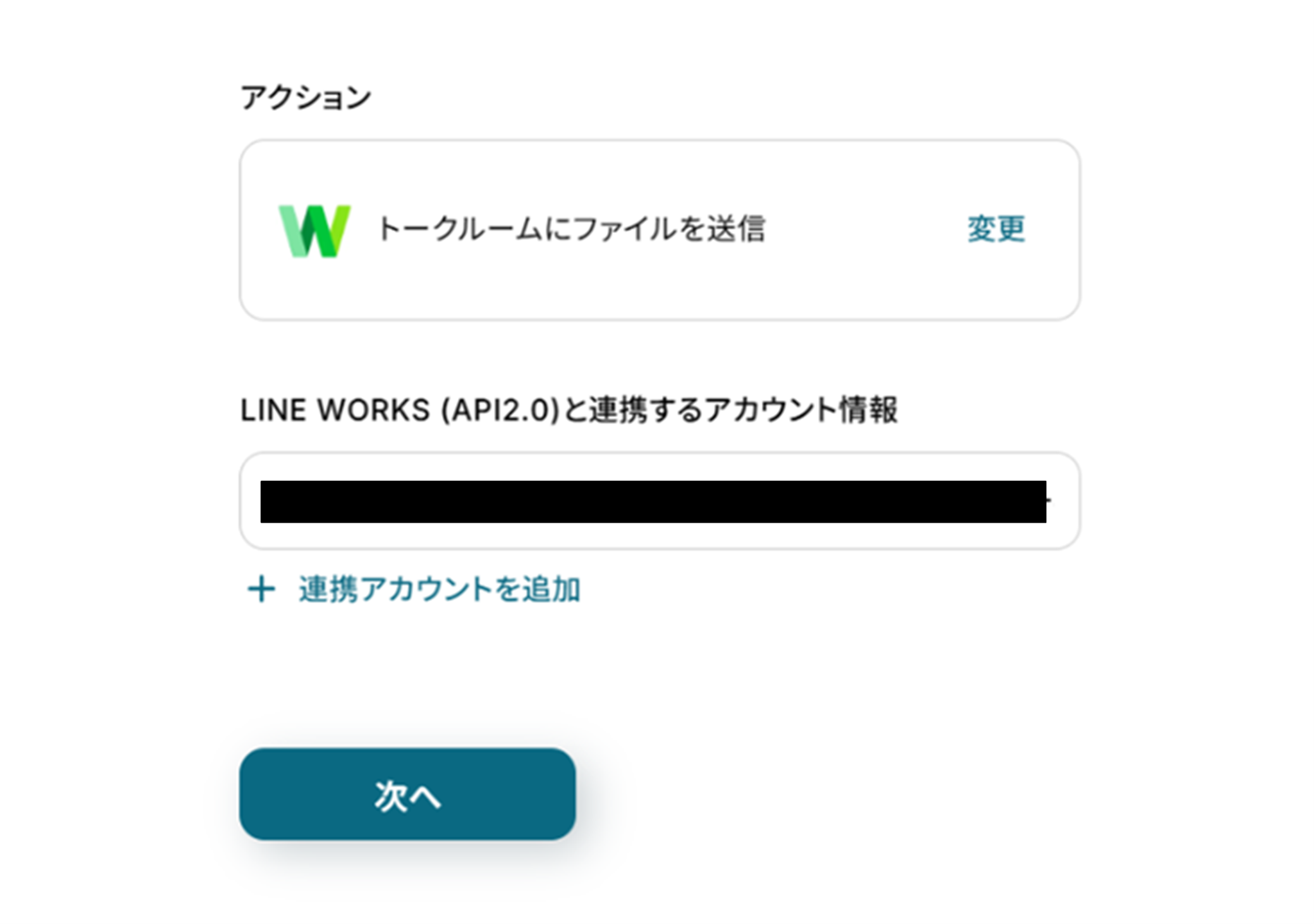 (2)「連携アカウントとアクションを選択」画面から、LINE WORKSと連携するアカウント情報に誤りがないかを確認し、アクションは「トークルームにファイルを送信」のままで「次へ」をクリックします。