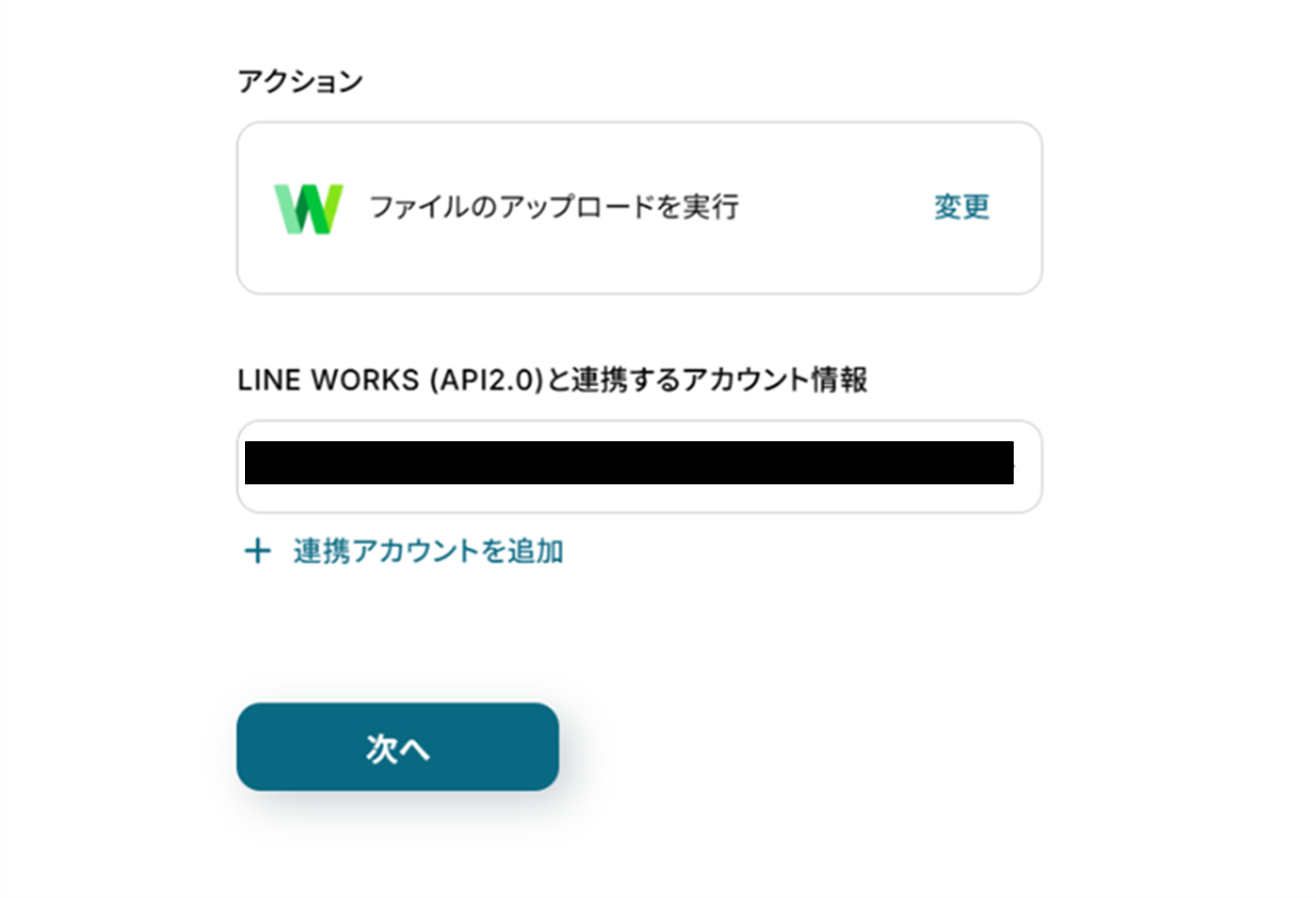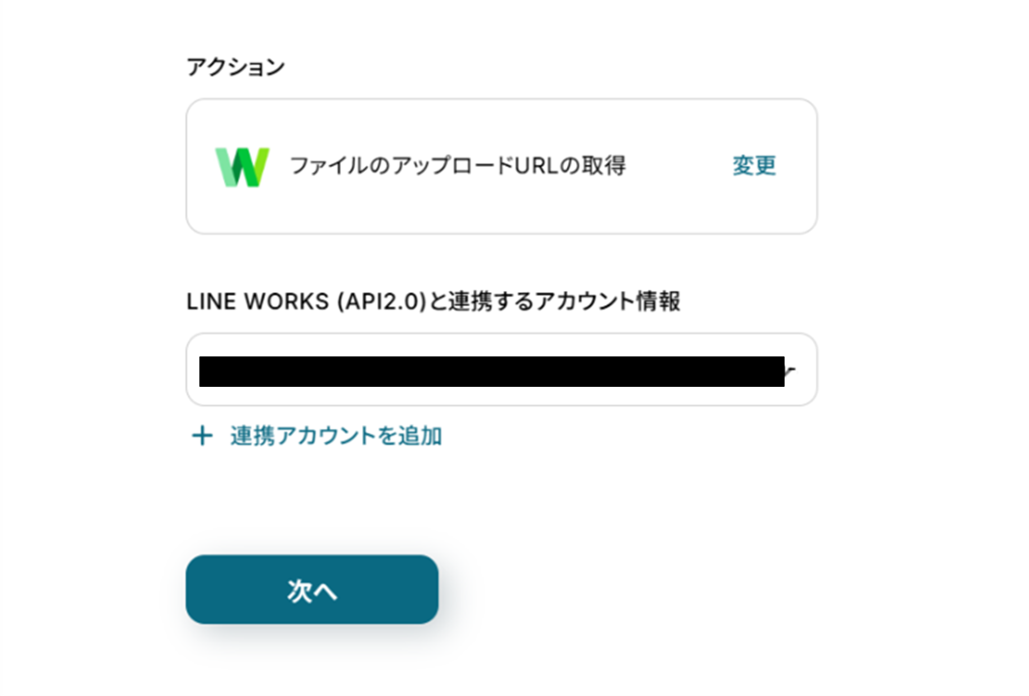 (2)「連携アカウントとアクションを選択」画面から、LINE WORKSと連携するアカウント情報に誤りがないかを確認し、アクションは「ファイルのアップロードURLの取得」のままで「次へ」をクリックします。
