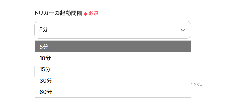 トリガーの起動間隔はプルダウンより5分、10分、15分、30分、60分の間隔から選択してください。