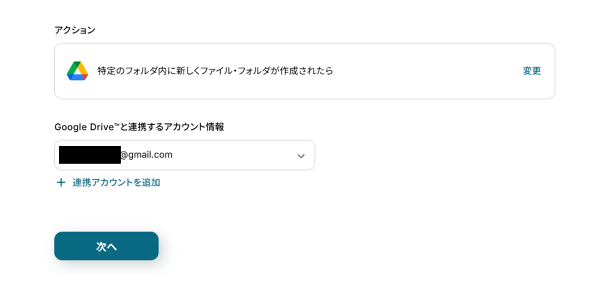 (3)「連携アカウントとアクションを選択」画面から、Google Driveと連携するアカウント情報に誤りがないかを確認し、アクションは「特定のフォルダ内に新しくファイル・フォルダが作成されたら」のままで「次へ」をクリックします。