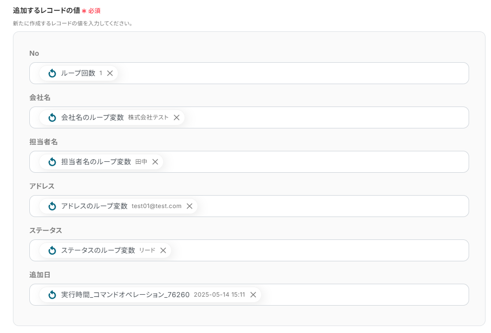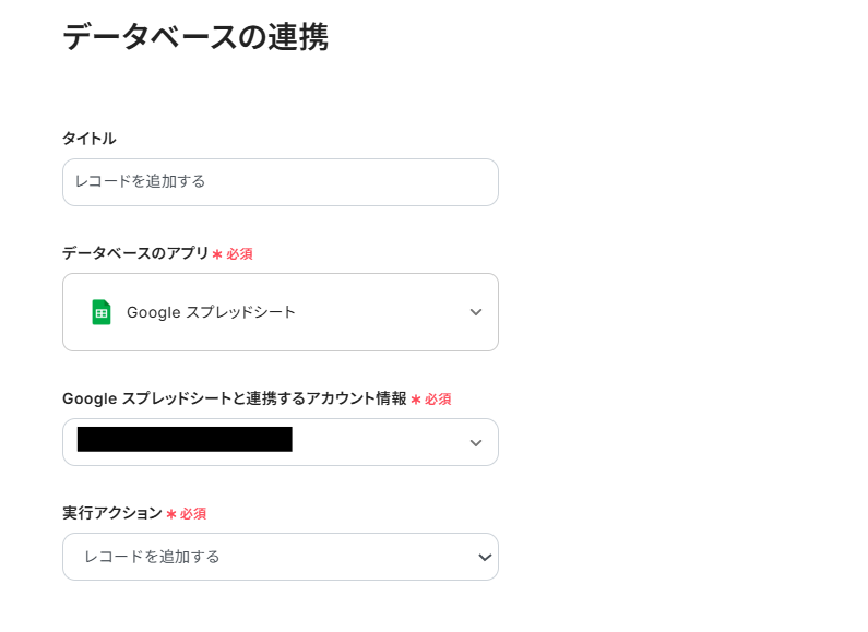 Google スプレッドシートにレコードを追加する際、Asanaから取得したタスク名や担当者、期日といった情報を、スプレッドシートのどの列に追加するかを任意で設定できます。 例えば、「A列にタスク名」「B列に担当者名」のように、管理したい項目に合わせて出力内容を柔軟にカスタマイズすることが可能です。 ■注意事項