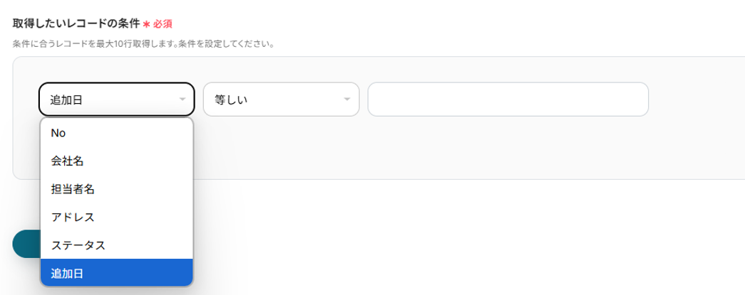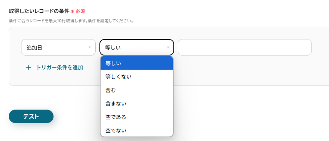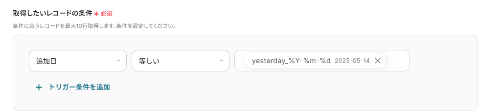 ここでは、前日に追加されたものを取得するイメージです。 左は「追記日」、真ん中は「等しい」、右は「昨日の日付」を選択していきます。
