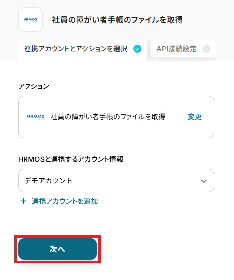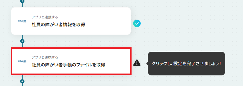 - 続けて、オペレーションでHRMOSの「社員の障がい者手帳のファイルを取得」アクションを設定します。