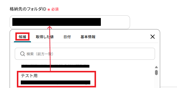 - Google Driveのファイルアップロード設定では、ファイルの格納先となるフォルダIDや、保存する際のファイル名を任意で設定できます。