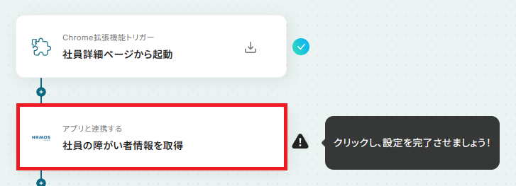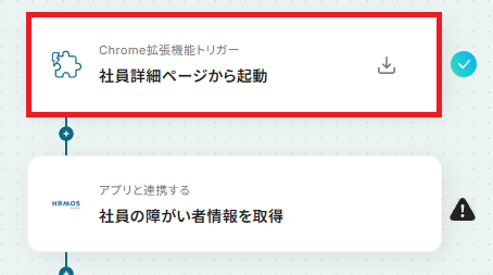 設定方法としては、「Chrome拡張機能トリガー」の直下に『社員の個人基本情報を取得』アクションを追加し、あらかじめ「社員名」や「社員番号」を取得してください。