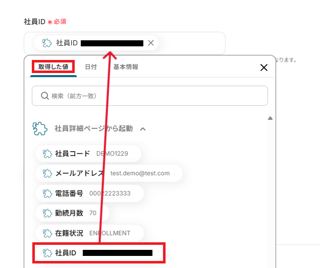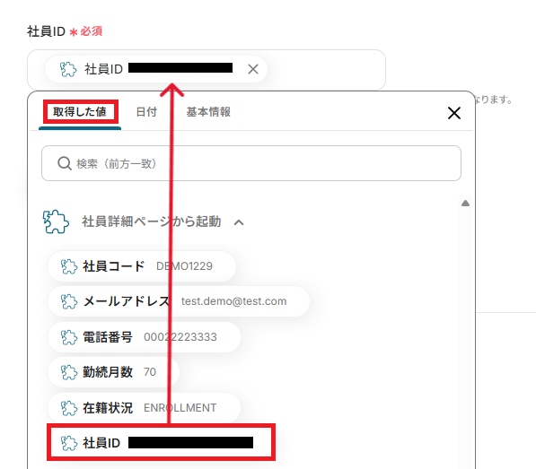 取得した社員IDを基に、障がい者情報を取得する設定を行います。