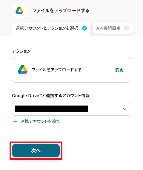 - 最後に、オペレーションでGoogle Driveの「ファイルをアップロードする」アクションを設定し、取得したファイルを格納します。