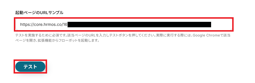 「起動ページのURLサンプル」に、テストを実施する社員詳細ページのURLを入力しましょう。