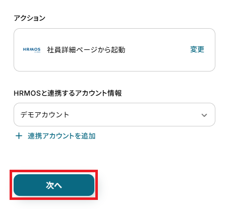 再度、Yoomと連携するHRMOSのアカウントに間違いがないかを確認し「次へ」をクリックしましょう。