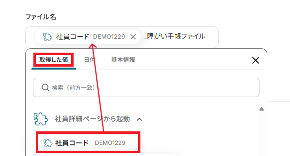 ファイル名は任意の内容で設定でき、取得した値を利用することで、トリガーが実行されるたびに最新の社員名や社員番号を自動的に反映させることができます。
