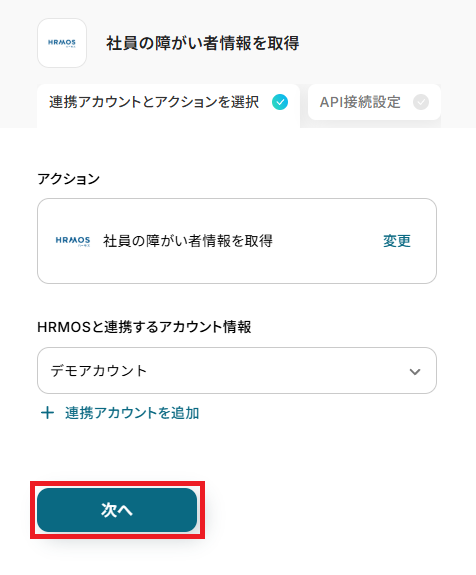 - 次に、オペレーションでHRMOSの「社員の障がい者情報を取得」アクションを設定します。