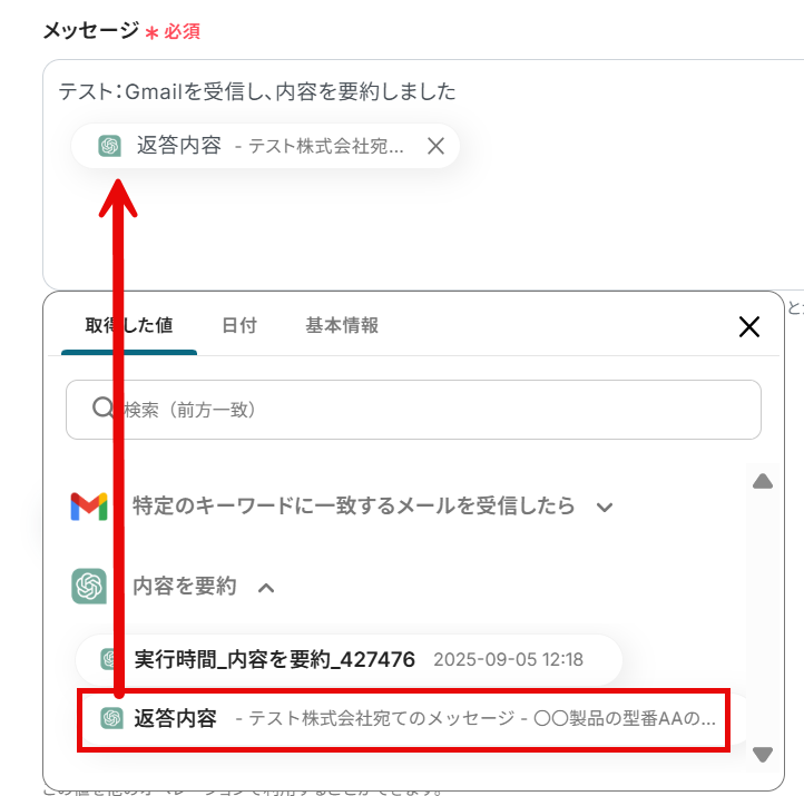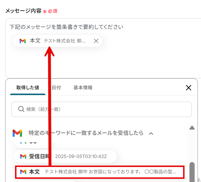 はじめにChatGPTに要約の指示文を入力し、前項で取得した値から「本文」を選択します。