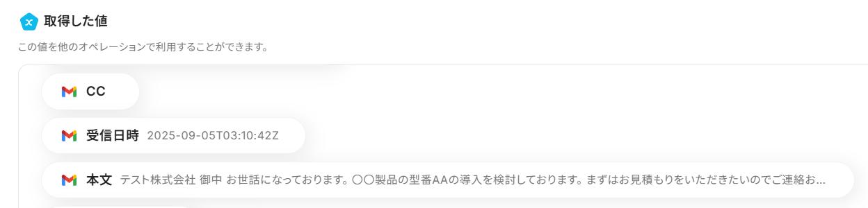 取得した値を使用することで、テキストが固定化されず、フローボットが起動するたびに新しい値が反映されます。
