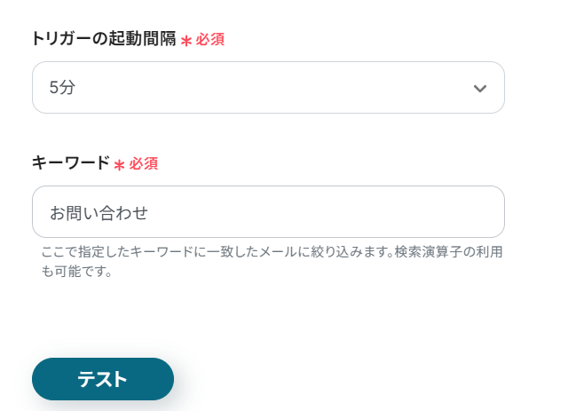 今回は「お問い合わせ」というキーワードに一致したメールを絞り込むように設定しました。