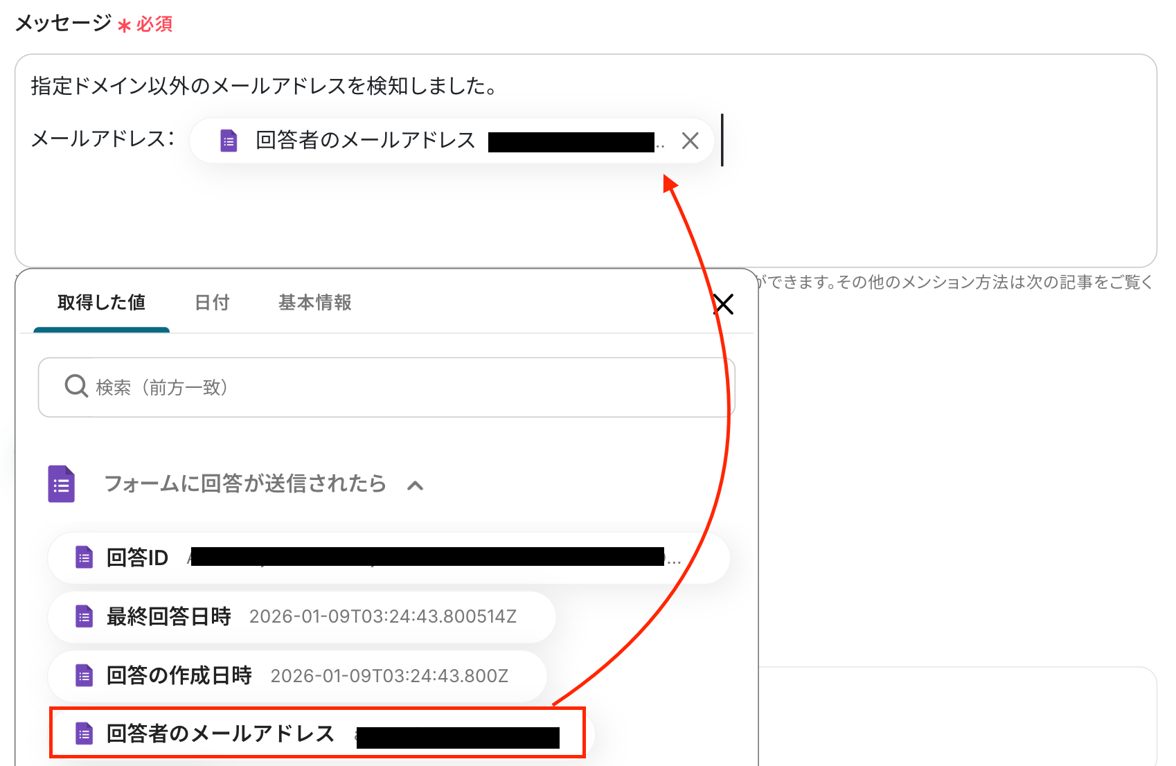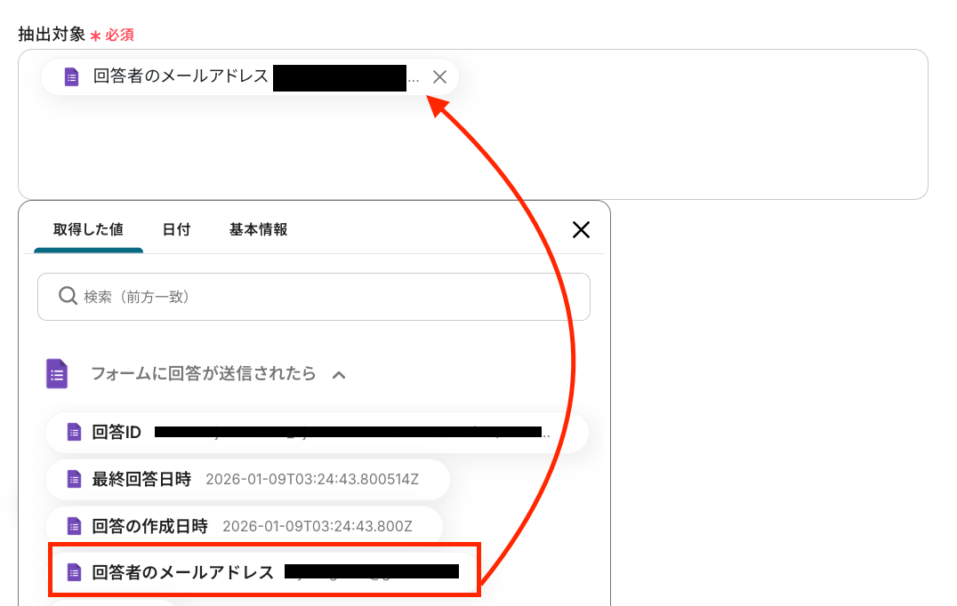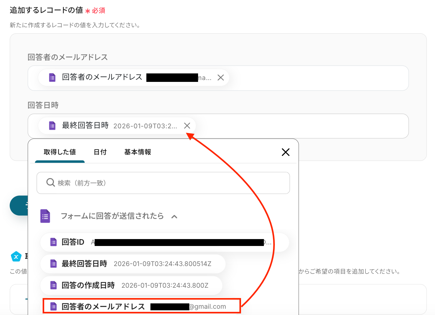 入力欄をクリックすると、先ほど取得した値が表示されるので「回答者のメールアドレス」を選択してください。