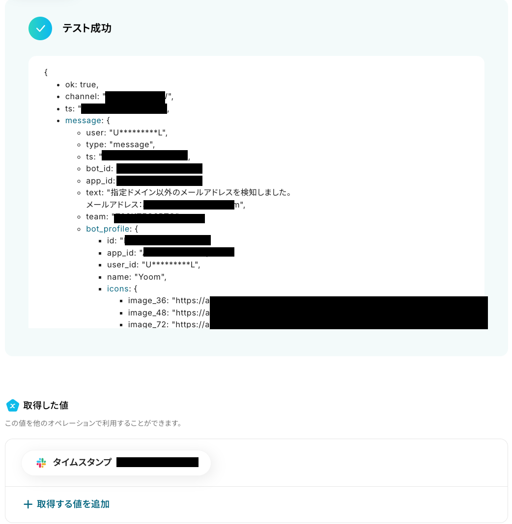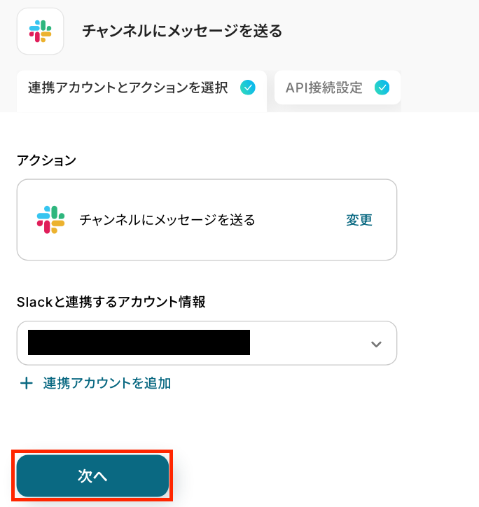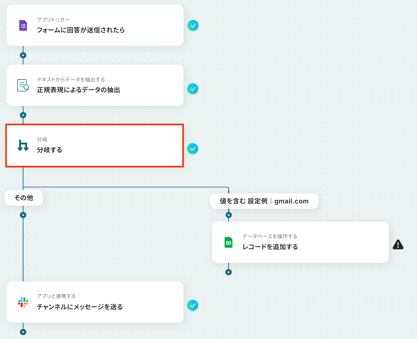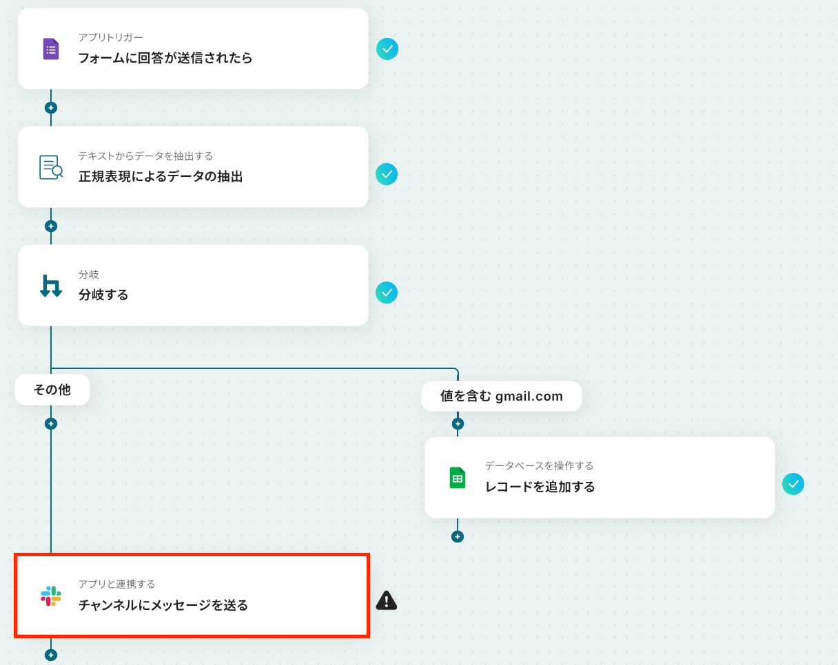 - 条件に合致しない場合は、Slackの「チャンネルにメッセージを送る」アクションで担当者に確認依頼を通知します