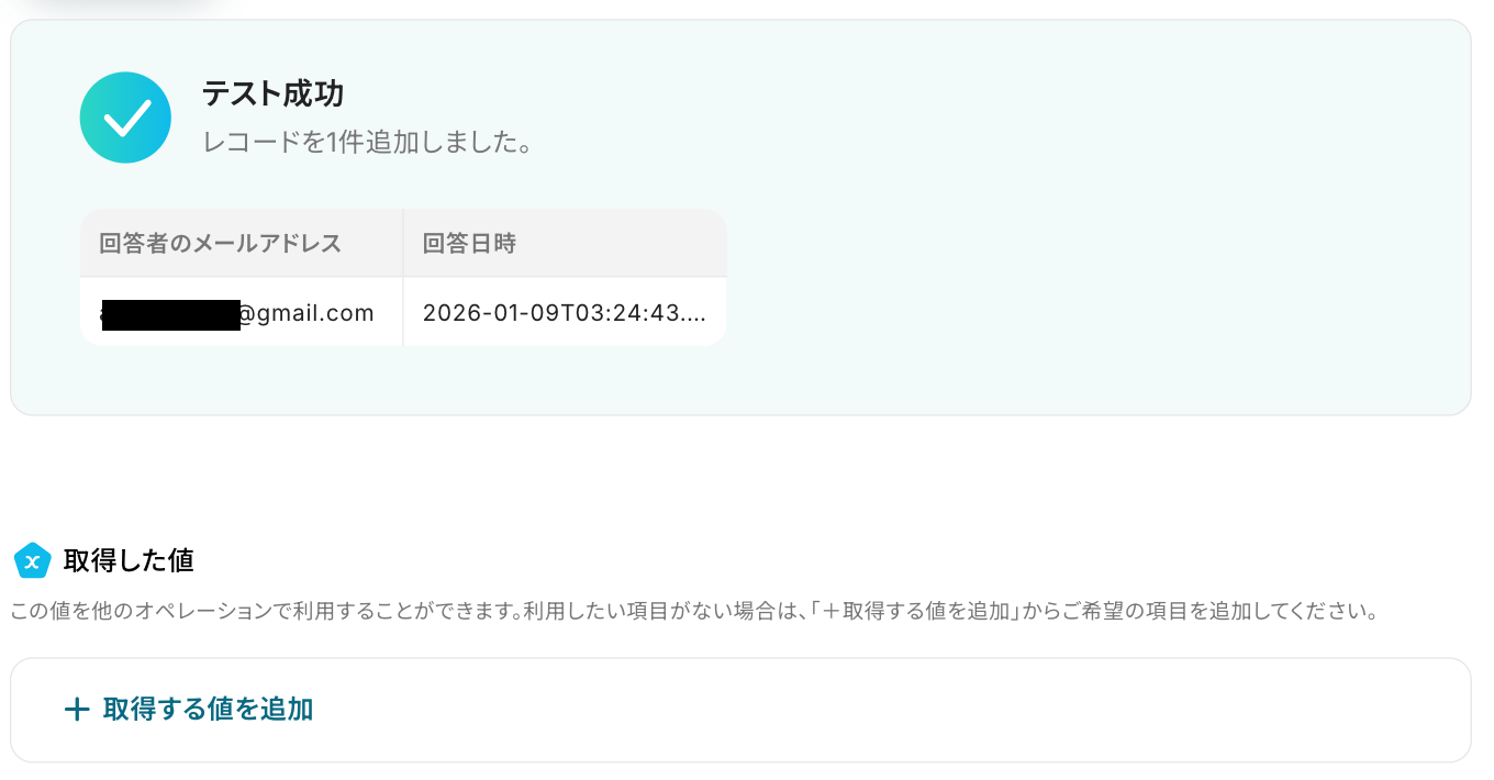 テスト後に表示される「回答者のメールアドレス」は空欄で表示されますが、「+取得した値を追加」をクリックすると取得できます。