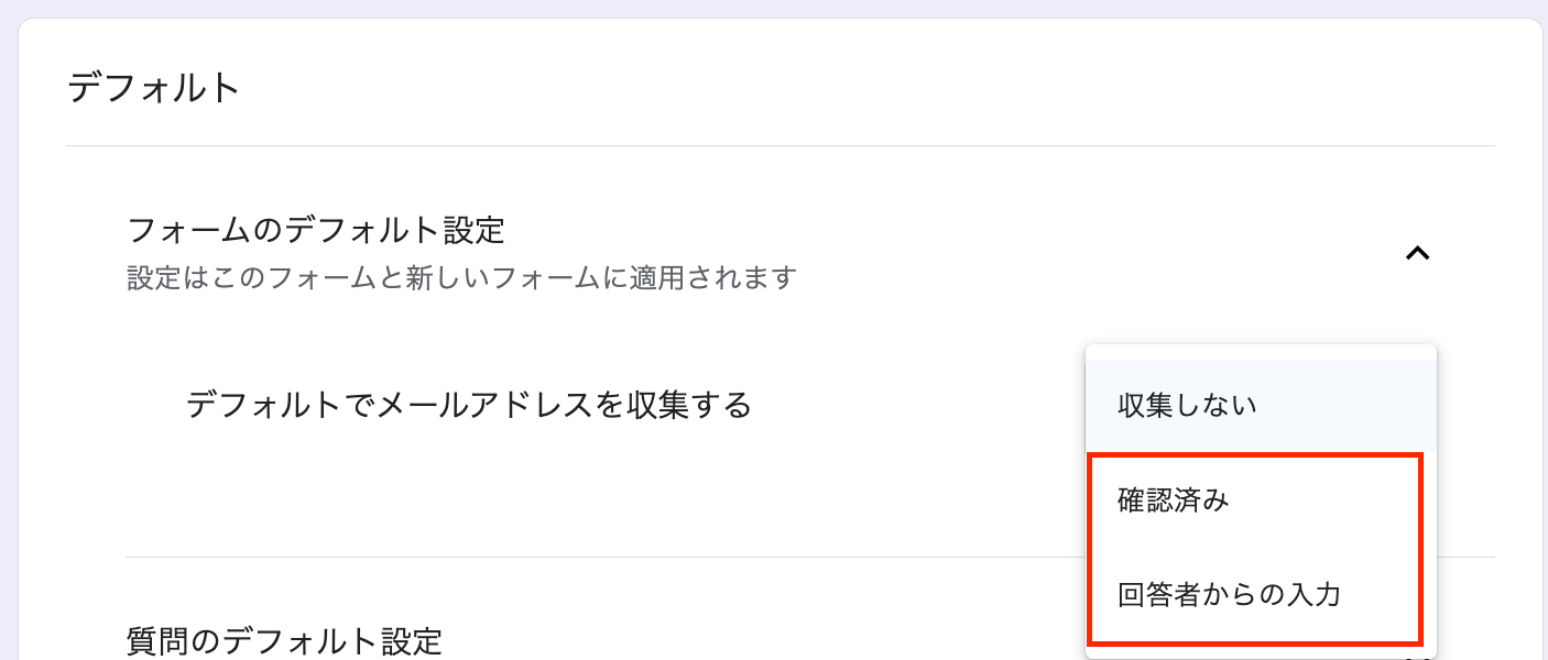「回答者の入力」:質問項目に「メールアドレス」の項目が設けられ、回答者がメールアドレスを入力することで取得できます。