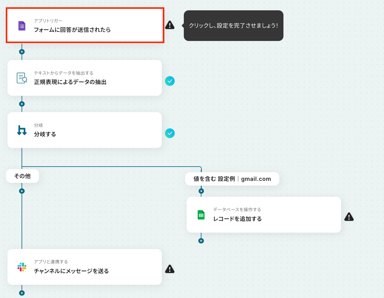 それではここから代表的な例として、Googleフォームに回答が送信されたら、メールアドレスの形式をチェックして、問題がある場合にSlackへ確認依頼を送るフローを解説していきます!