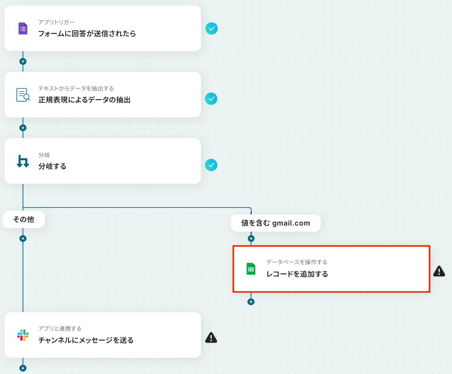 - 条件に合致する場合は、Google スプレッドシートの「レコードを追加する」アクションで回答内容を記録します