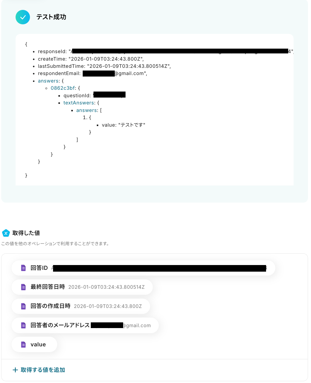 - GoogleフォームのアウトプットはJSONPathから取得可能です。取得方法は「『取得する値』を追加する方法」の「応用編:JSONPathを使って『取得する値を追加』する」をご参照ください。「responses[*].answers~」という形式でJSONPathを設定することで一覧を取得可能です。