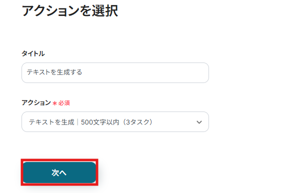 2) アクションは「テキストを生成する 500文字以内」が選択されています。任意で修正をして次へ進んでください。