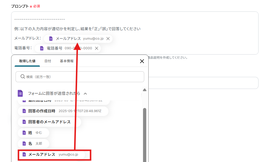 プロンプトはアウトプットから選択してフォーム内容を反映して入力してください。