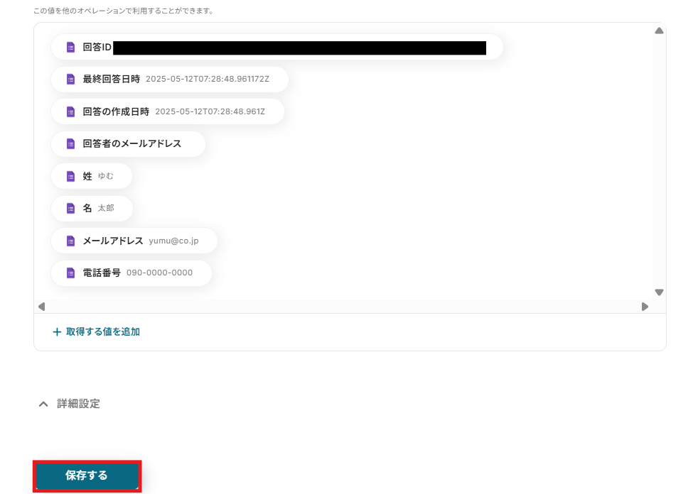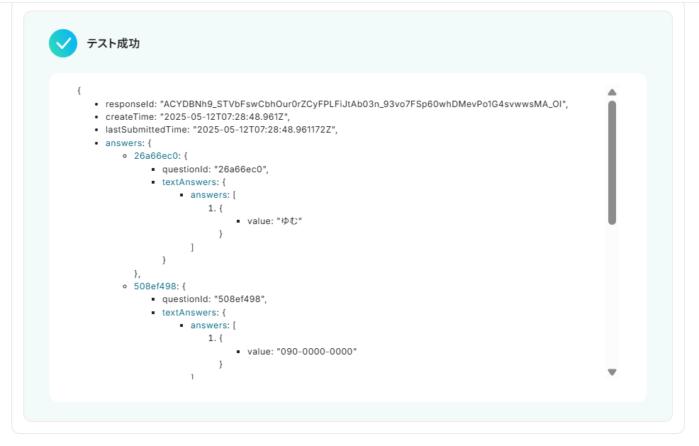・Googleフォームをトリガーとして使用した際の回答内容を取得する方法は下記をご参照ください。