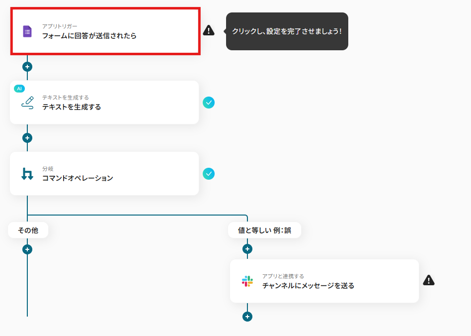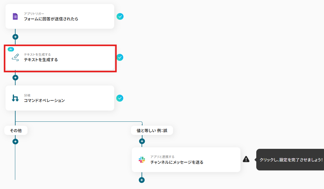 これで【Googleフォームの回答内容をAIでバリデーションチェックし、Slackに通知する】というフローが完成です。