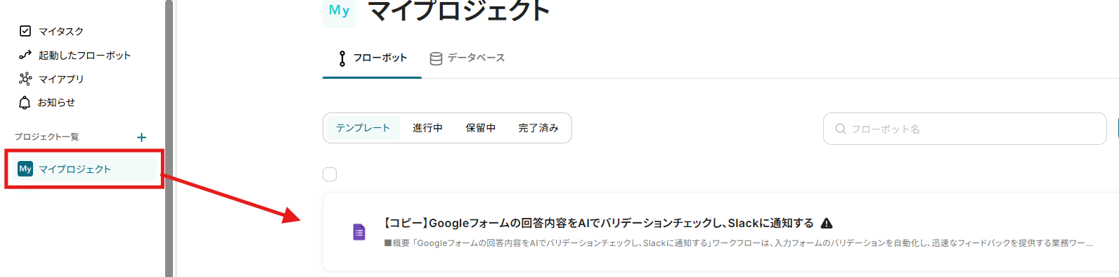 また、コピーしたテンプレートはマイプロジェクトに保存されているので、マイプロジェクトからも開くことができます。