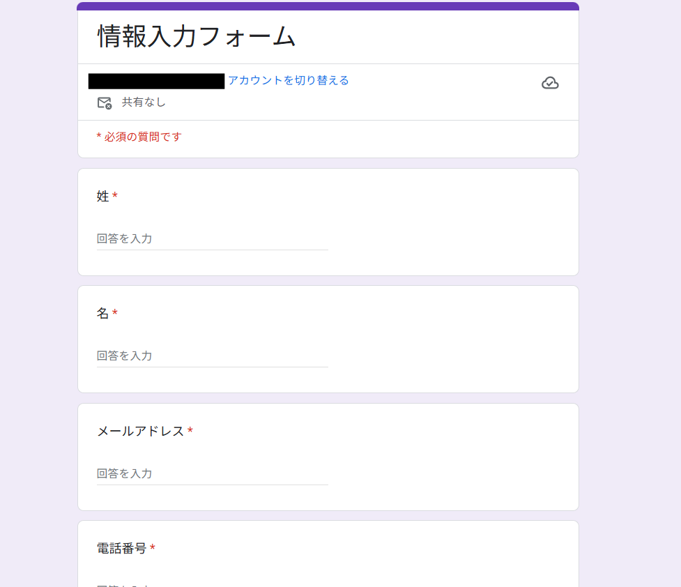 今回はGoogleフォームの回答内容をAIでバリデーションチェックするため、事前に以下のような回答フォームを作成しました。