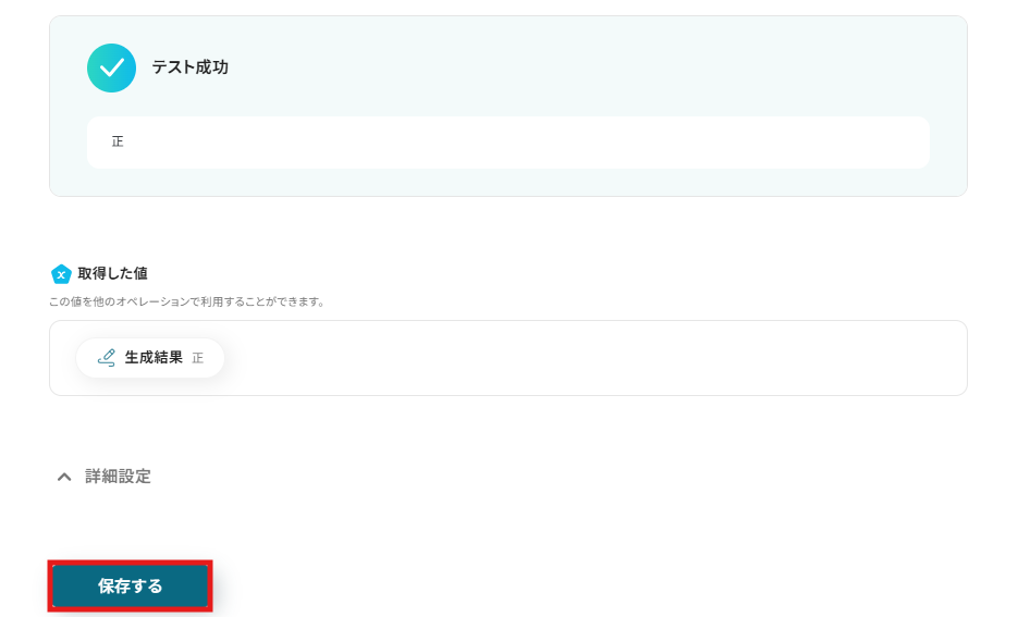 2) 分岐対象のアウトプットのオペレーションは「テキストを生成する」、アウトプットは「生成結果」が選択されていることを確認し、分岐条件が「生成結果」「と等しい」「誤」になっていることを確認して「保存」をクリックします。