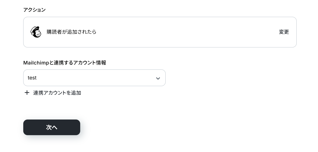 (2)Mailchimpと連携するアカウント情報に誤りがないかを確認し、アクションは「購読者が追加されたら」のままで「次へ」をクリックしましょう。