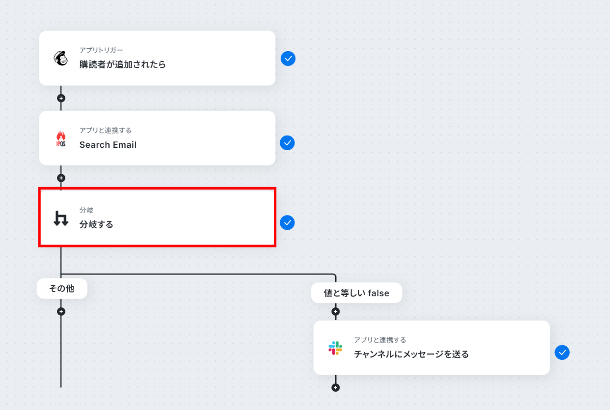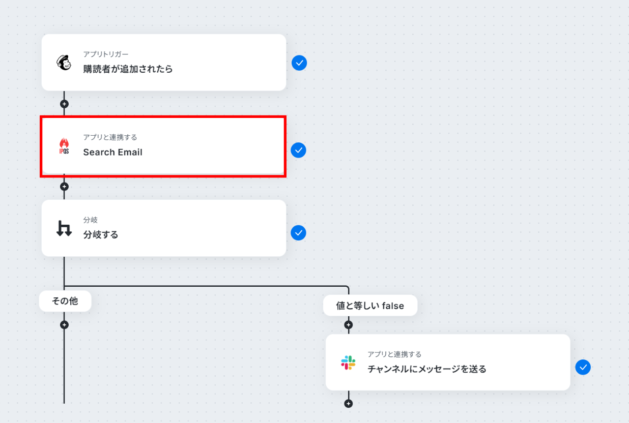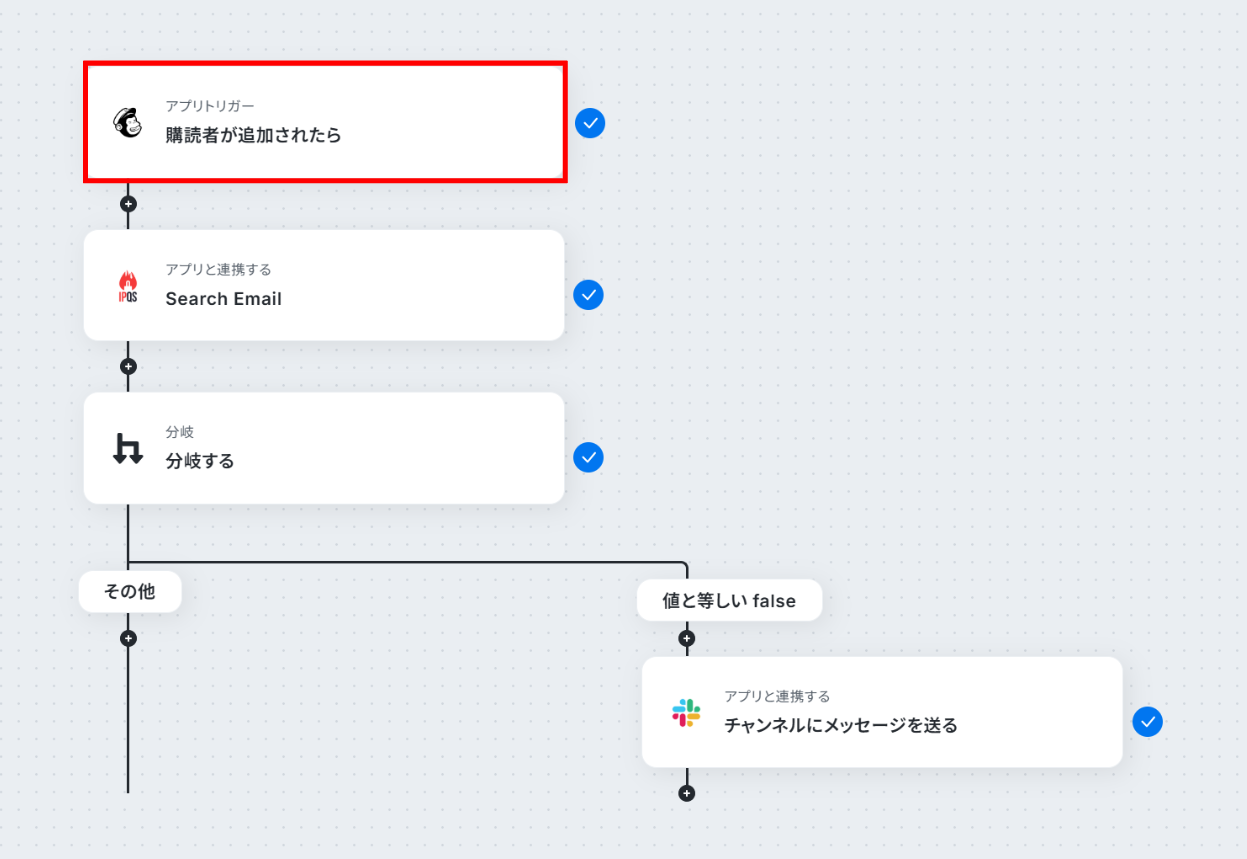 Mailchimp・IPQualityScore・Slackを連携するフローを作ってみよう それではここから代表的な例として、Mailchimpに購読者が追加されたら、IPQualityScoreでEmailを検証し、有効でない場合はSlackで通知するフローを解説していきます!
