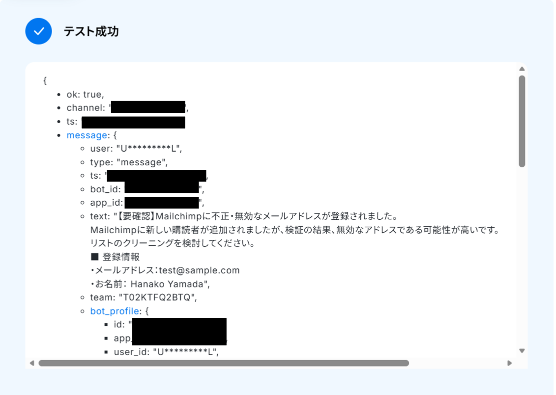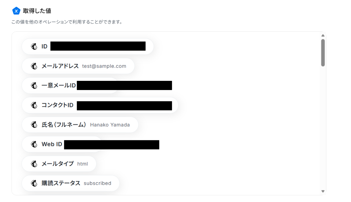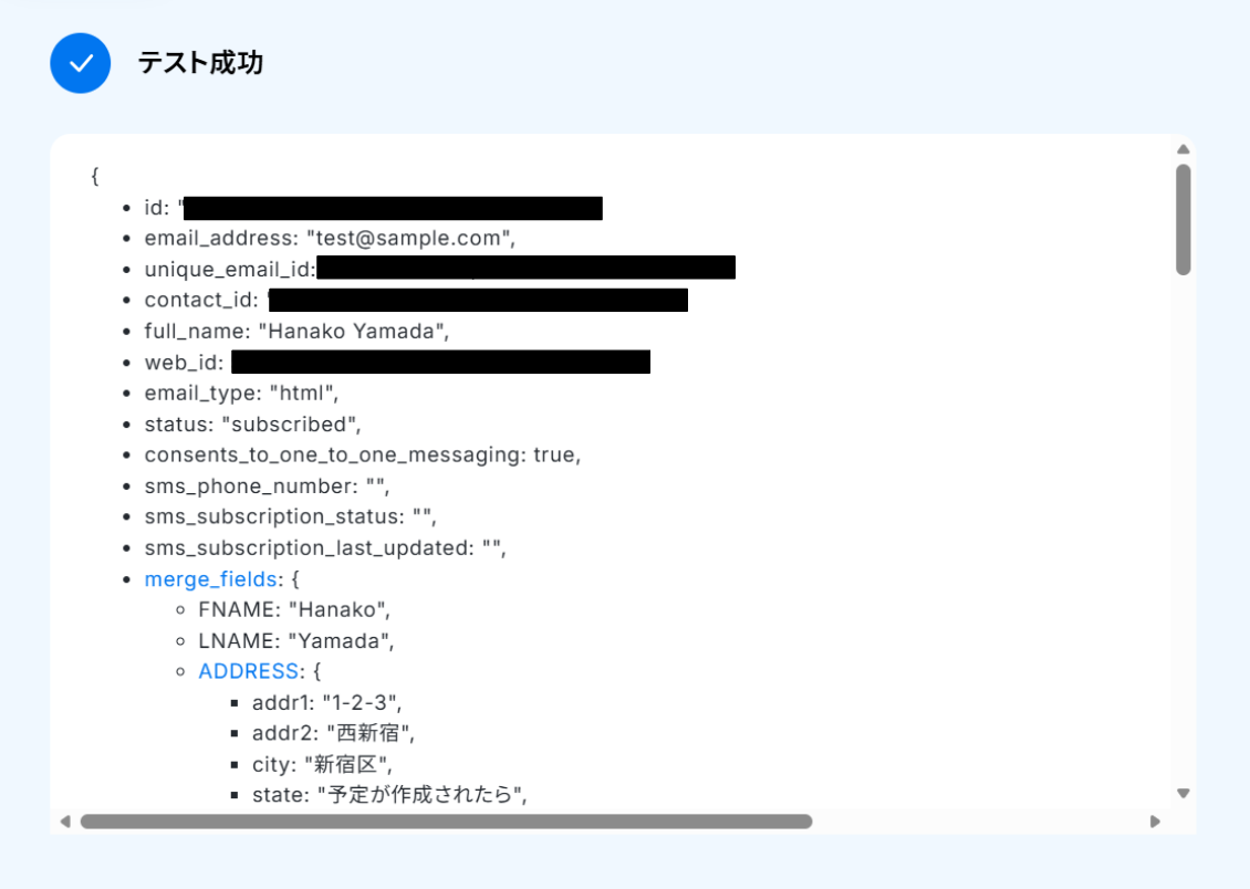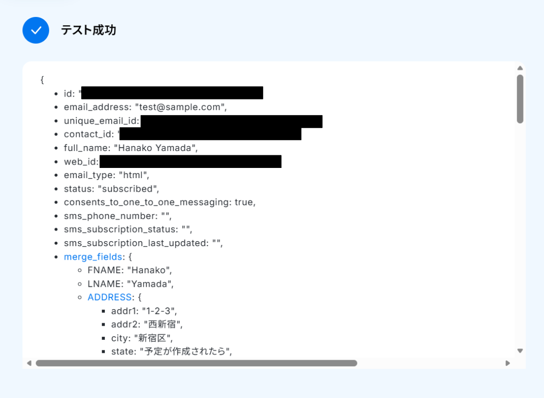 テストに成功すると、取得した値にMailchimpの情報が反映されます。 「取得した値ってなんだろう?」と思った方は下のページをご参照ください。