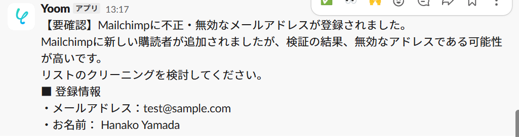 実際にフローボットを起動して、Mailchimpで購読者が追加されたら、IPQualityScoreでEmailを検証し有効でない場合はSlackで通知されているかを確認してみてくださいね!
