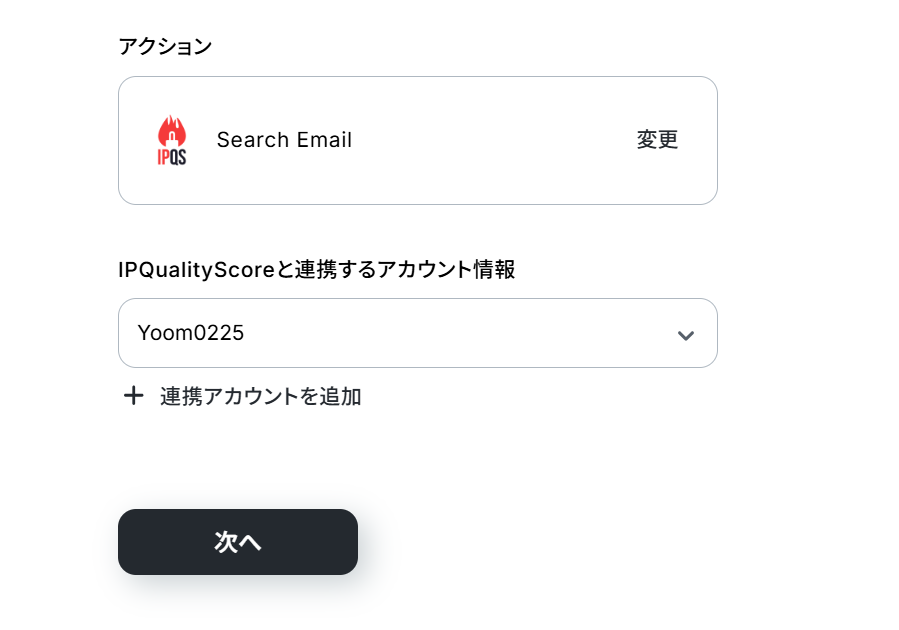 (2)IPQualityScoreと連携するアカウント情報に誤りがないかを確認し、アクションは「Search Email」のままで「次へ」をクリックしましょう。