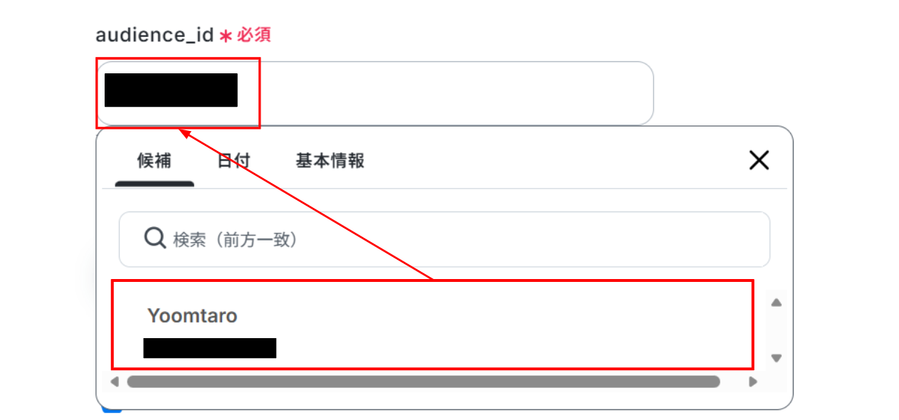 下へ進み、「audience_id」を候補から選択します。 入力が終わったら「テスト」をクリックしましょう。