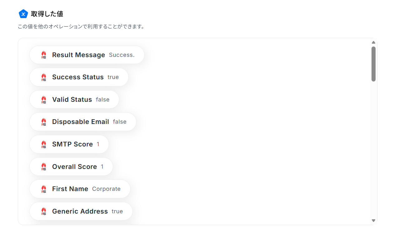 テストに成功すると、「取得した値」にIPQualityScoreの検索結果が追加されます! 「完了」をクリックして次の工程に進みましょう。
