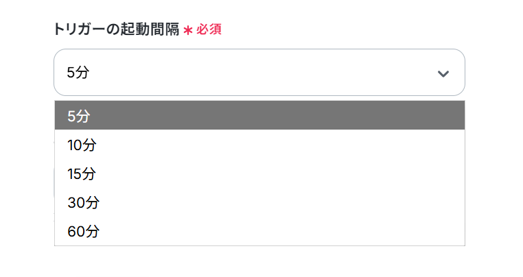 (3)「API接続設定」画面から、トリガーの起動間隔を選択します。 トリガーの起動間隔はプルダウンより5分、10分、15分、30分、60分の間隔から選択してください。