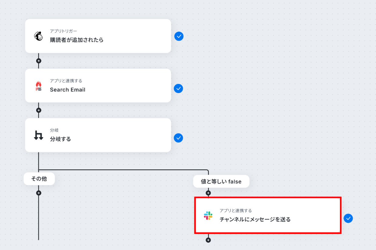 Mailchimpのトリガー設定では、検証の対象としたいオーディエンス(audience_id)を任意で指定してください IPQualityScoreのアクションでは、検証の条件を任意で設定してください 分岐機能では、IPQualityScoreの検証結果(有効、無効など)をもとに、Slackへ通知する条件を自由にカスタマイズできます Slackへの通知設定では、通知先のチャンネルを任意で設定でき、メッセージ本文には固定のテキストだけでなく、どのメールアドレスが無効だったかといった情報を変数として埋め込むことが可能です ■注意事項