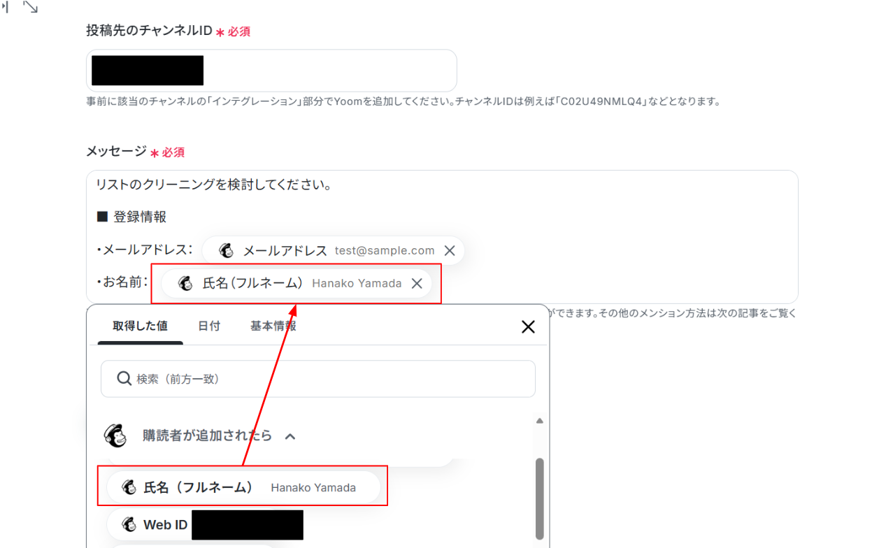 (6)投稿先のチャンネルIDは候補から選択します。 メッセージには固定文と一緒に「取得した値」を使うことができます!