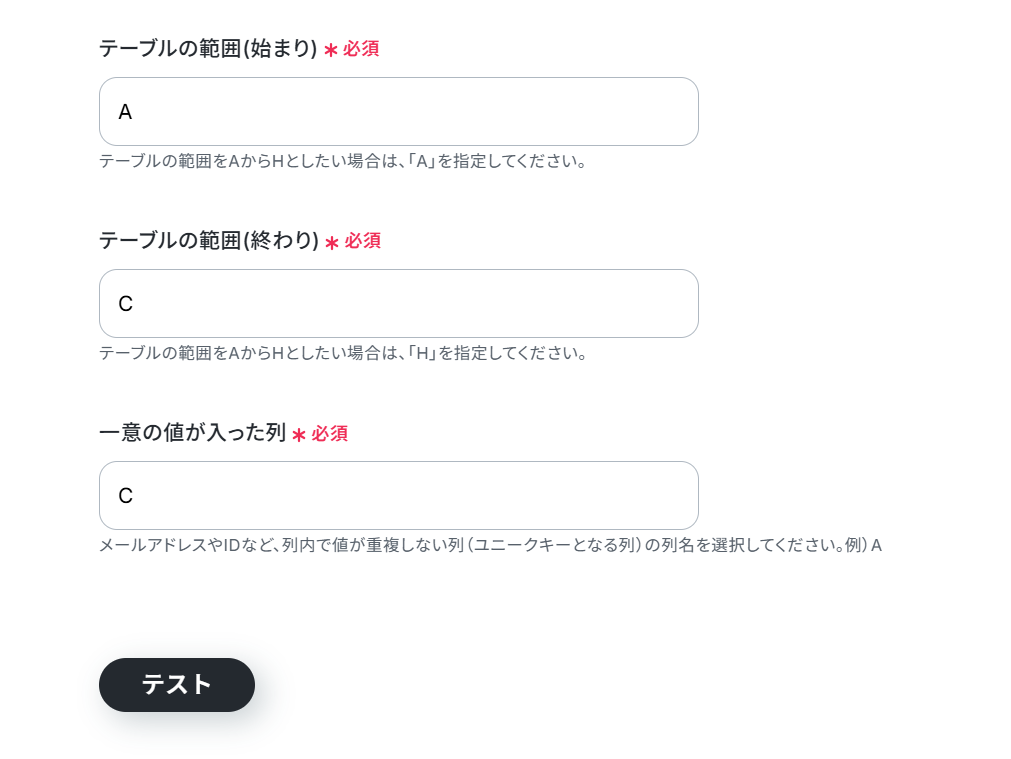 対象のシートのテーブル範囲と一意の値が入った列をアルファベットで入力します。 入力が終わったら「テスト」をクリックしましょう。