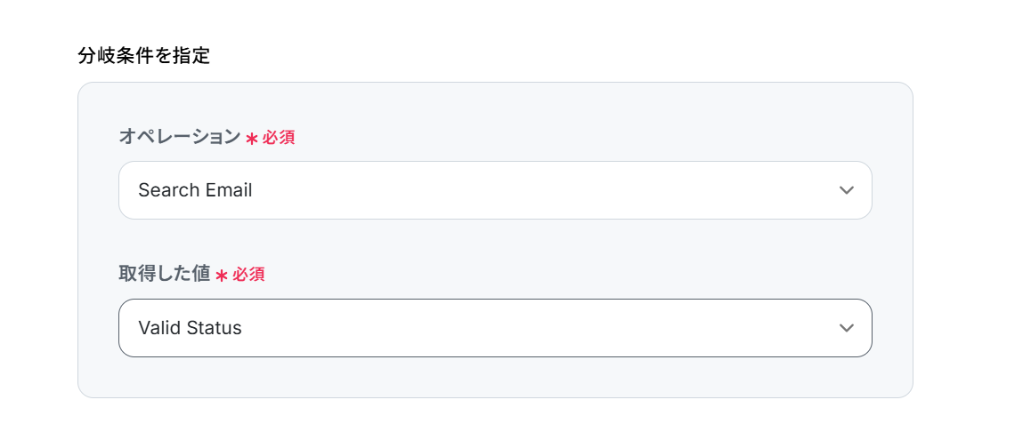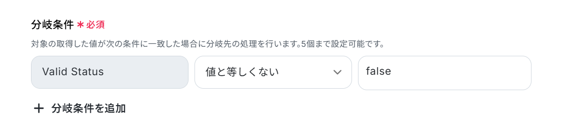 グレーの部分は固定値となっています。 画像では「Valid Status」が「false」でないものを条件に設定しています。 設定が完了したら「完了」をクリックしましょう。