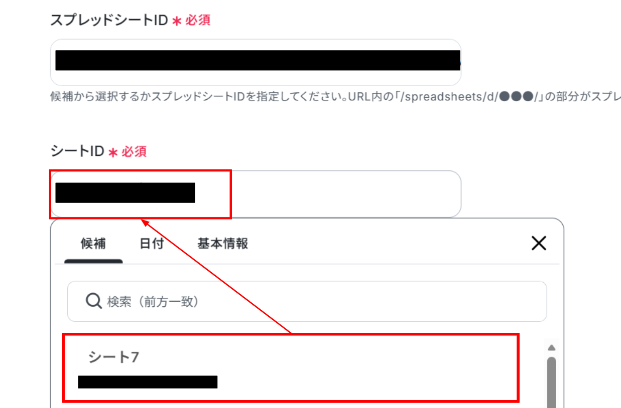 下へ進み、Google スプレッドシートIDとシートIDを候補から選択します。