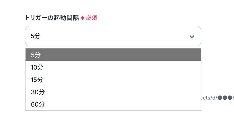 (3)「API接続設定」画面から、トリガーの起動間隔を選択します。 トリガーの起動間隔はプルダウンより5分、10分、15分、30分、60分の間隔から選択してください。