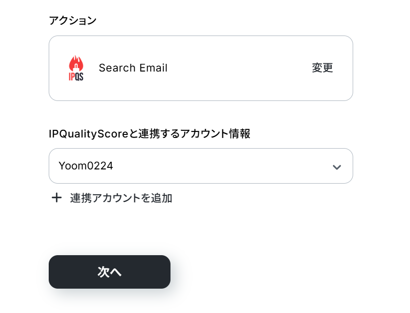 (2)IPQualityScoreと連携するアカウント情報に誤りがないかを確認し、アクションは「Search Email」のままで「次へ」をクリックしましょう。