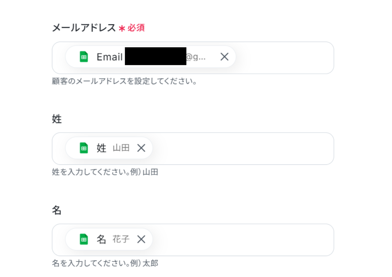 (3)「Email」にGoogle スプレッドシートで取得した値を使って入力します。 以降の項目は必須項目ではありません。必要な項目に入力を行ってください。 入力が終わったら「テスト」をクリックしましょう。
