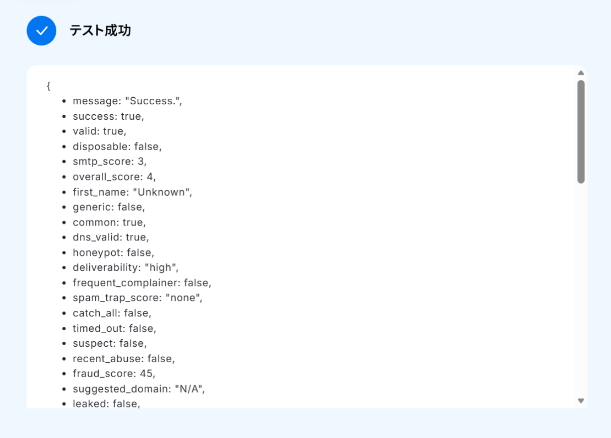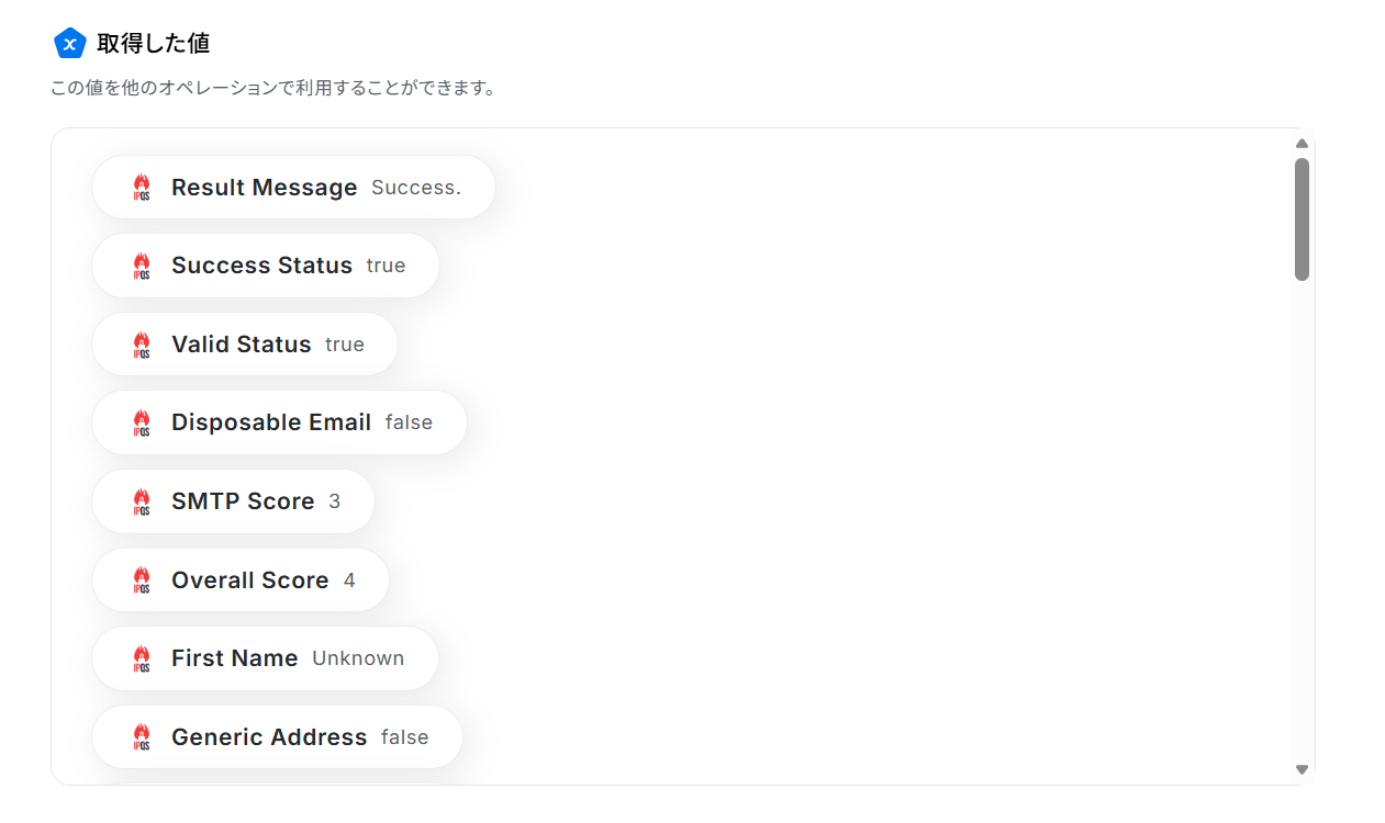テストに成功すると、「取得した値」にIPQualityScoreの情報が追加されます! 「完了」をクリックして次の工程に進みましょう。
