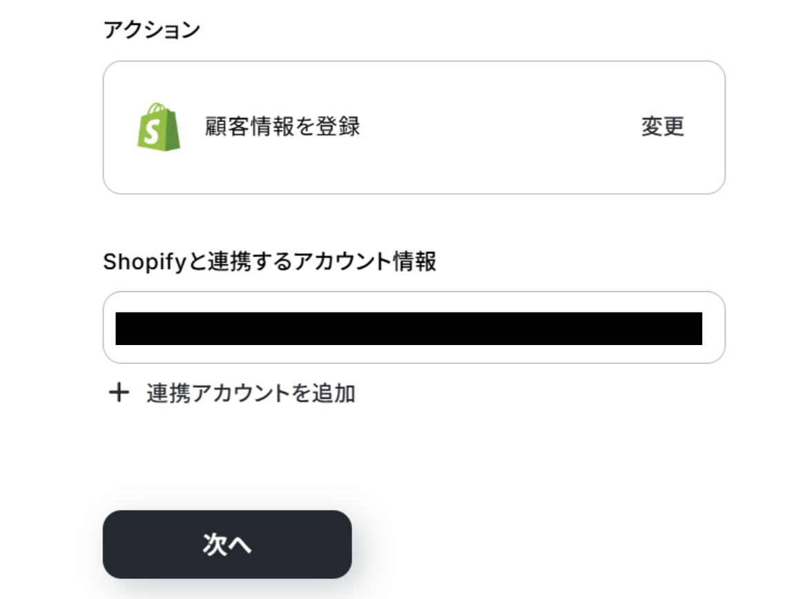 (2)Shopifyと連携するアカウント情報に誤りがないかを確認し、アクションは「顧客情報を登録」のままで「次へ」をクリックしましょう。
